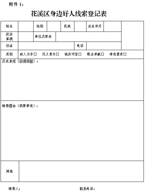 (一)填写《身边好人线索登记表》,发送至电子邮箱hxqwmb@163.com或邮寄至贵阳市花溪区明珠大道花溪区行政中心A506办公室,中共花溪区委宣传部(区精神文明办)。