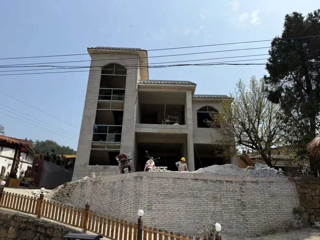 村民和施工团队一起抓紧工期修建民宿