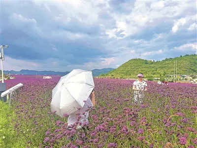 漫步石门锦绣田园景区,漫山遍野的马鞭草犹如一片浪漫的紫色海洋,雨后初晴的阳光穿过云层,为花海镶上一道金边,给人带来无尽的惊喜和愉悦。紫色花海与翠绿的草甸、花丛中的橙色风车、远处的白色帐篷和乡村民居相呼应,形成绝美的“多巴胺色系”,吸引游客穿梭于白色栅栏围成的花间小路,不时拍照“打卡”。