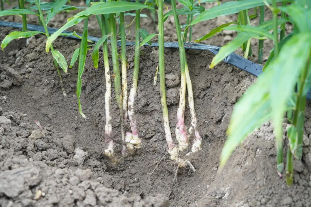 马铃村的土壤与水源优势得天独厚,刘正银通过土地流转,整合了100亩连片土地,进行集中、规范的种植。他的合作伙伴有丰富的生姜及香葱种植经验,成了生姜种植的技术负责人。为达到丰产和高品质的目的,生姜地还专门安装了滴灌带,能依据生姜不同生长阶段的需水情况,精准把控浇水量与浇水时间。