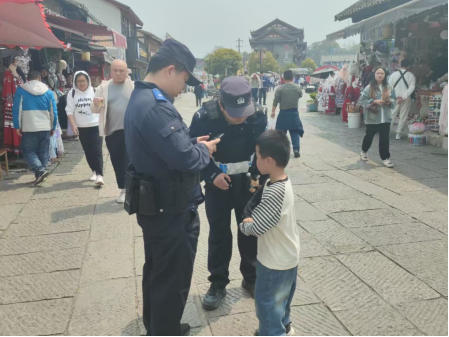 青岩古镇作为国家“5A”级旅游景区,每逢假日、人流量激增,常常会出现家长与孩子在人群中走散的情况,这时就要求广大民辅警出警快、找人准、处置高效,护航旅客出游平安。