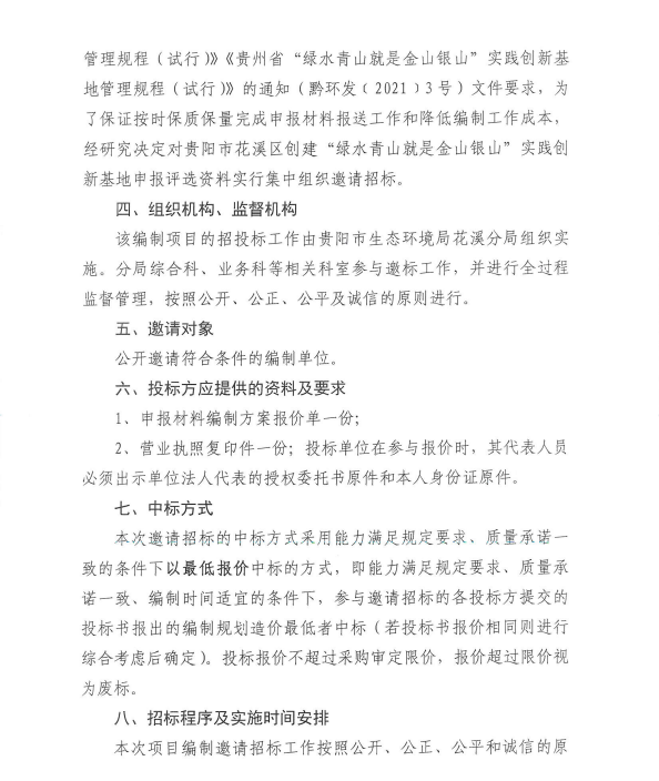 贵阳市花溪区创建“绿水青山就是金山银山”实践创新基地申报评选资料委托服务邀请招标实施方案