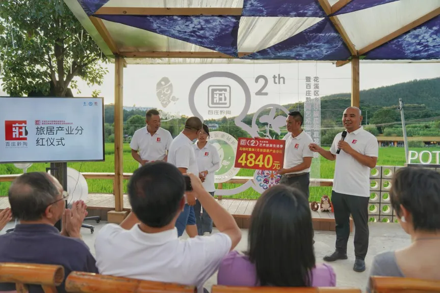 活动中,百庄黔陶乡村产业发展有限公司回顾近两年发展历程,展示“艺术旅居”模式在闲置资源盘活、特色业态培育上的成效,并向旅居代表和马场村村集体发放产业分红。