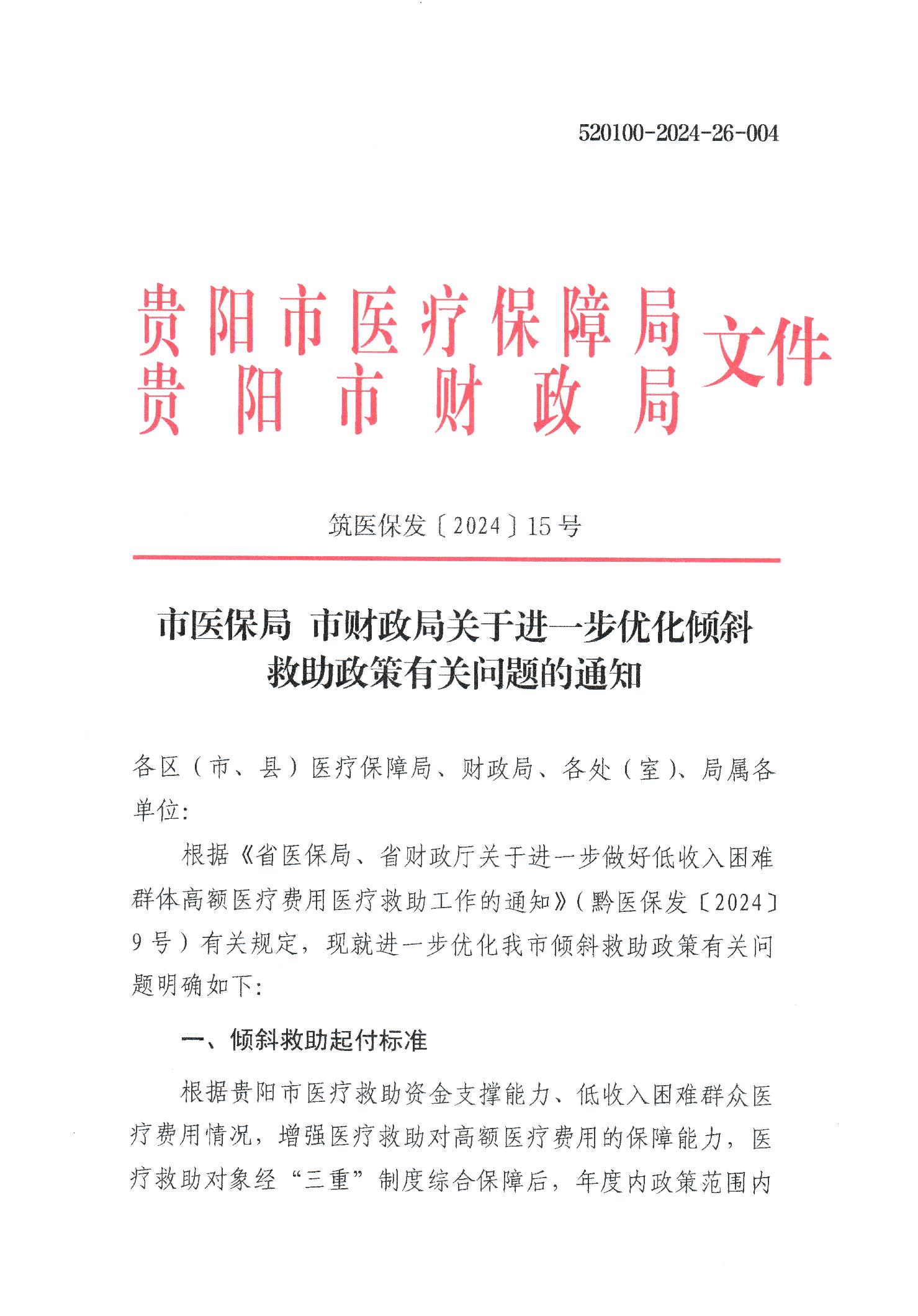 《市医保局 市财政局关于进一步优化倾斜救助政策有关问题的通知》(筑医保发〔2024〕15号)