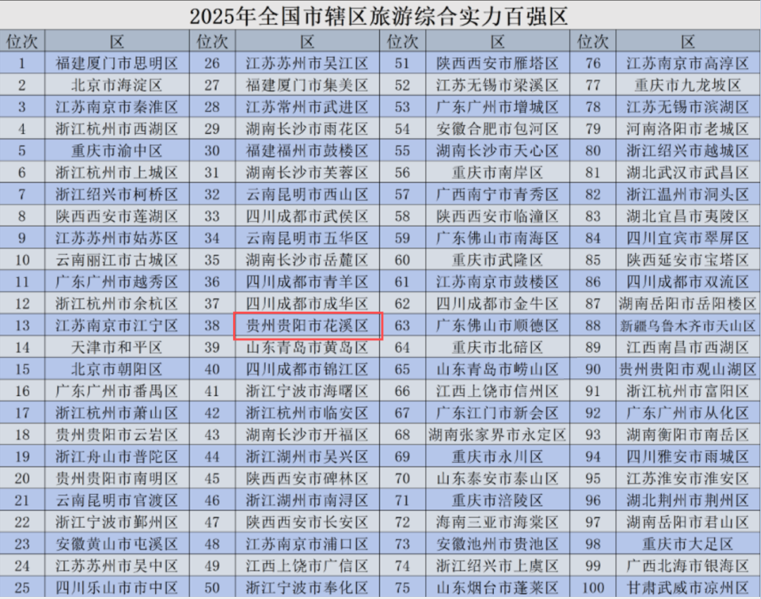近日,以“打造文旅新品牌 满足消费新需要”为主题的2025世界品牌莫干山大会·文旅系列活动,在浙江省湖州市德清县举办。活动期间,《全国市辖区旅游研究报告2025》正式发布,花溪区入选2025年全国市辖区旅游综合实力百强区,另外贵阳市入选的还有云岩区、南明区、观山湖区。