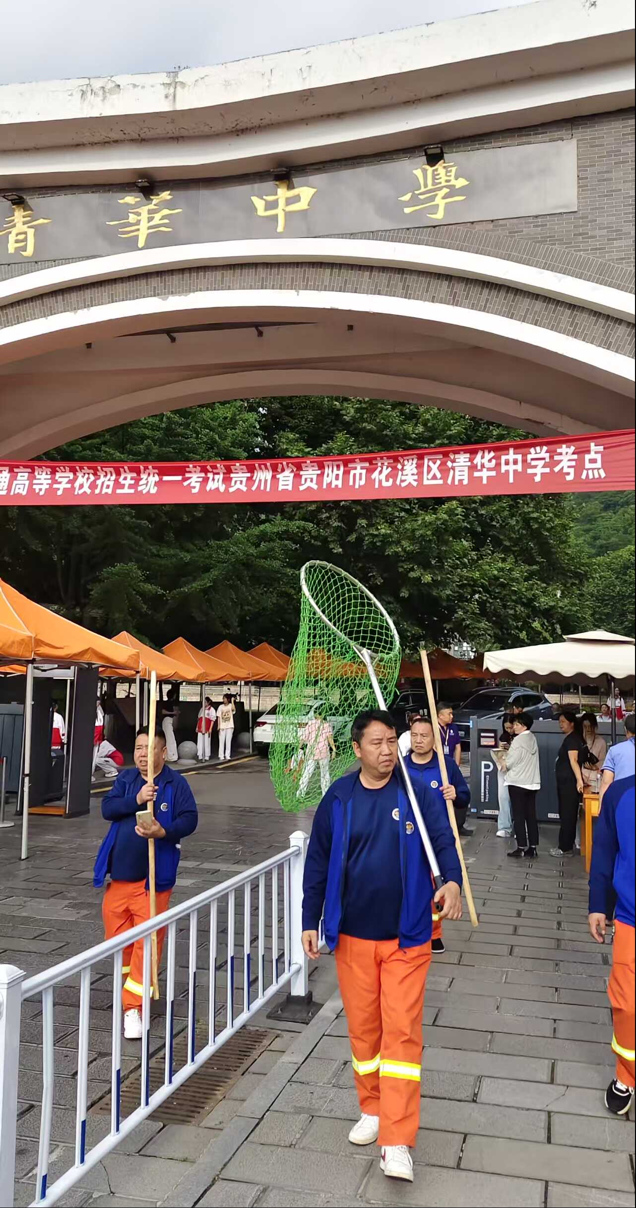 2025年6月,正值一年一度的高考时节,清华中学的考场外,家长们身着旗袍,面带微笑,挥手送孩子们步入考场。考场内,考生们正全神贯注地答题,而考场外,家长们秩序井然地静候。铃声响起,考生们面带笑容步出考场。然而,在家长和考生之间,有一支身着迷彩服的队伍,他们手持竹棒和网兜,执行着一项特别的任务。