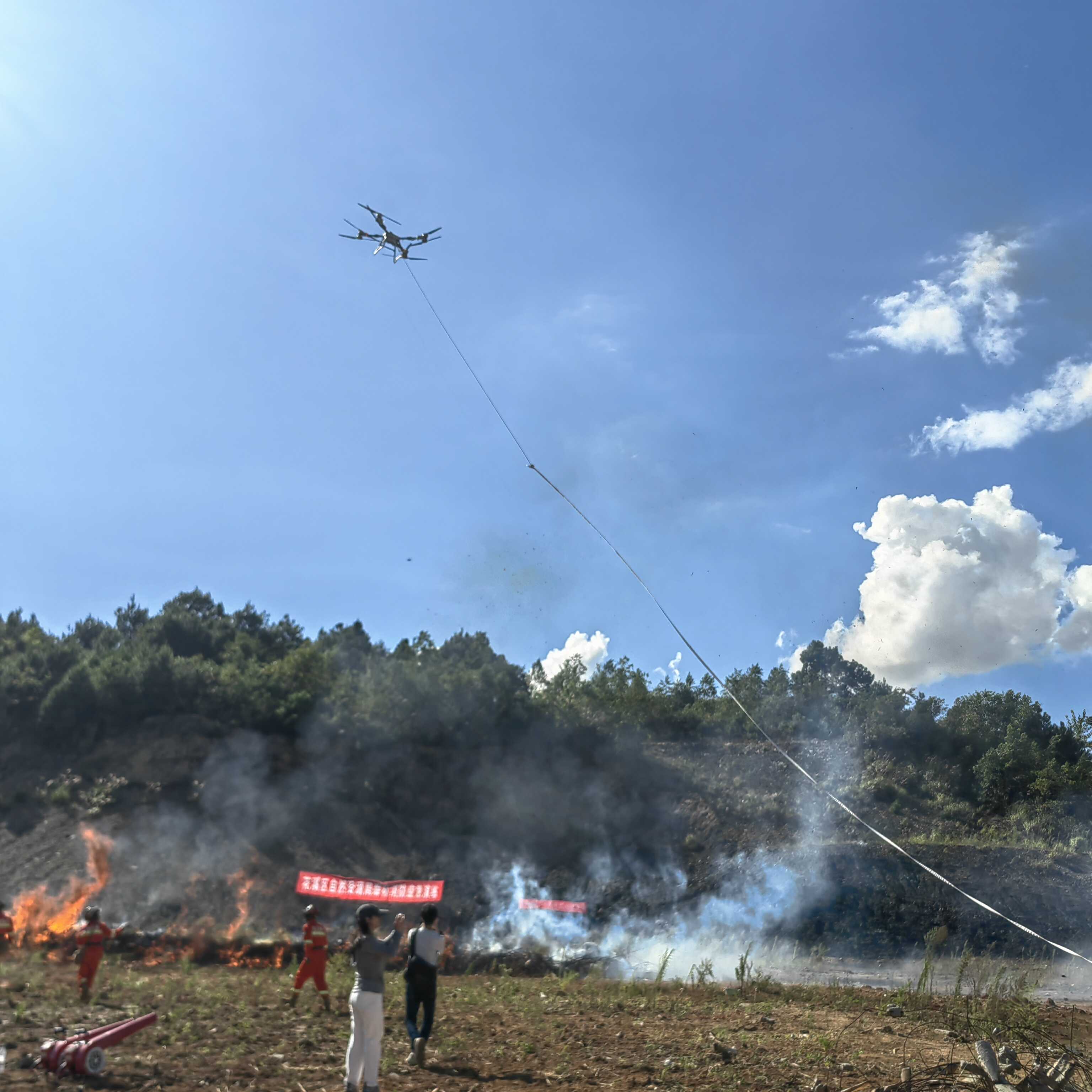 本次演练共分为六个场景分别为无人机巡护侦查火情、祭祀用火处置、农事用火处置、无人机调运物资、无人机铺设消防水带、人机协同处置火线,此六个场景一是利用无人机对重点林区进行巡护,发现、识别、定位并报告初期火情;二是模拟无人机在巡护中发现祭祀用火、农事用火并进行处置;三是人机挂载装有风力灭火机机油、脉冲式水枪(50kg左右)、水枪加压泵、油锯链条等关键配件的物资箱,飞行至模拟的“先锋小队”位置,进行精准空投;四是无人机向模拟的“前线指挥部”或“孤立小队”投送饮用水、急救包、高能量食品;五是无人机携带轻型、高强度的消防水带,沿预定路线快速飞行,精准将水带一端投送至火场附近水源处,另一端连接至消防泵或消防车,迅速建立起远程供水线路;六是地面消防队员与无人机形成协同作战。无人机在空中进行火场态势感知与指挥引导,地面队员利用无人机开辟的通道或在水带支援下,对主要火线进行集中扑打。