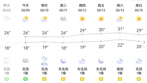 6月9日夜间到6月10日白天,阴天间多云有分散阵雨,主城区气温20~27℃;
