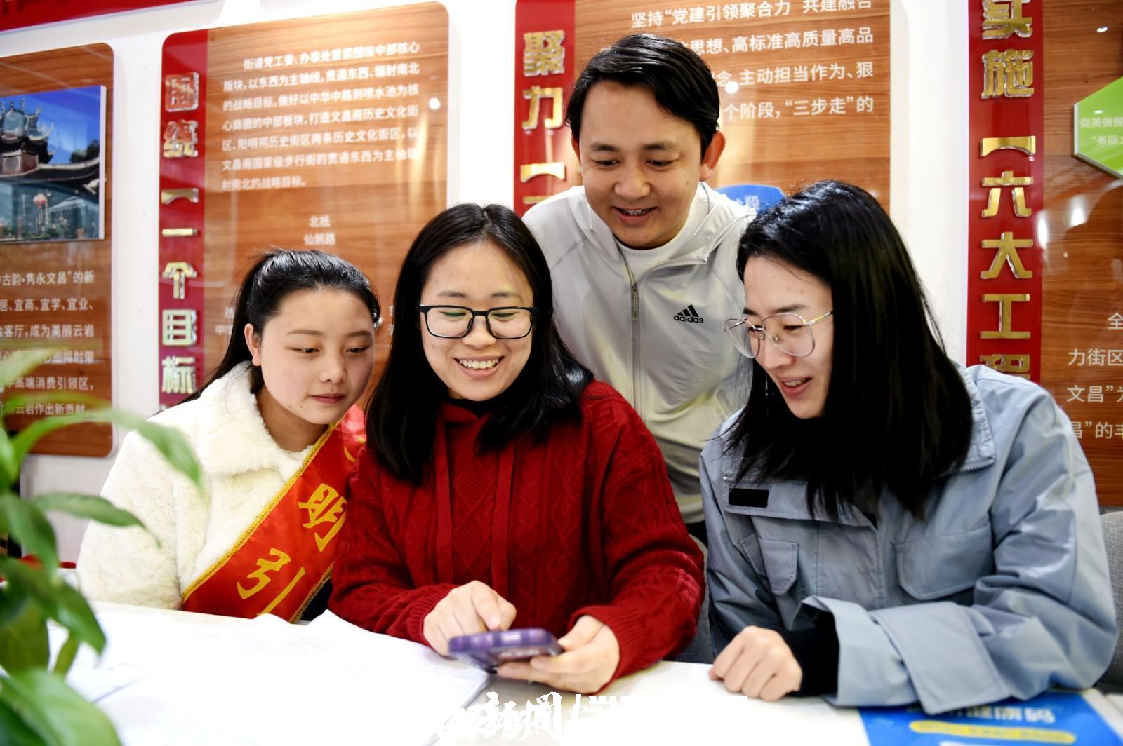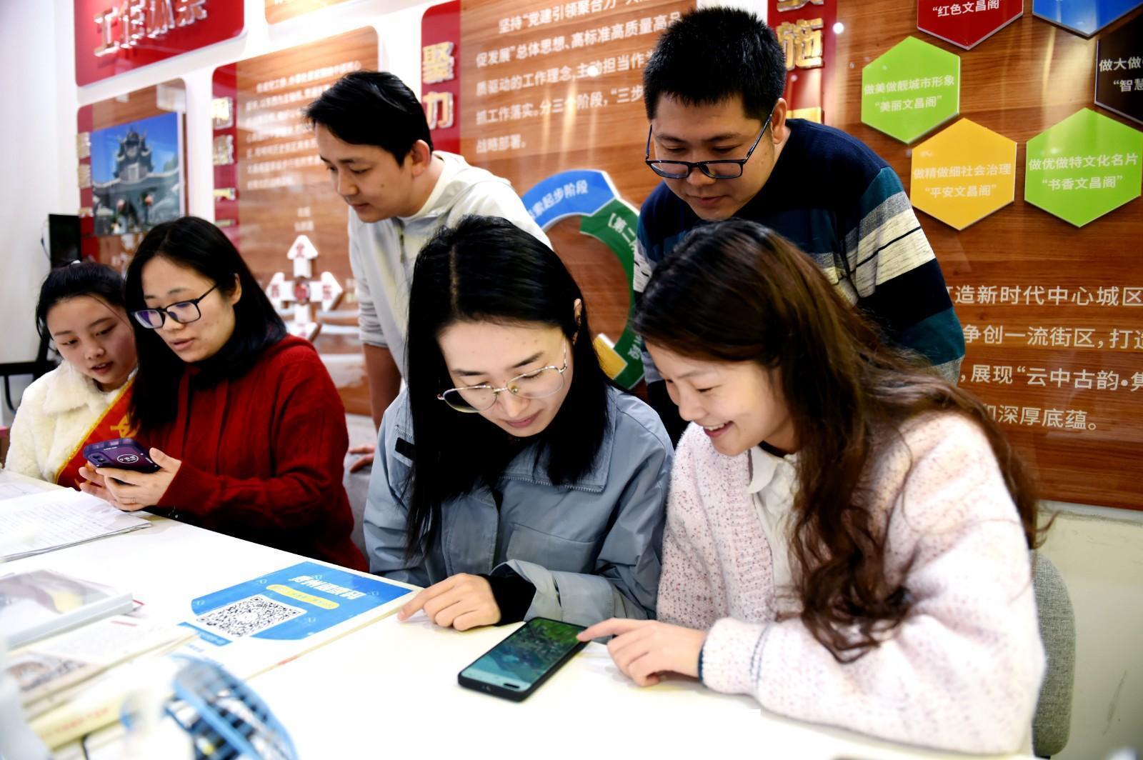 3月9日,在贵阳市云岩区文昌阁街道办事处,青年党员们通过移动端观看2023全国两会贵州“云上展馆”。