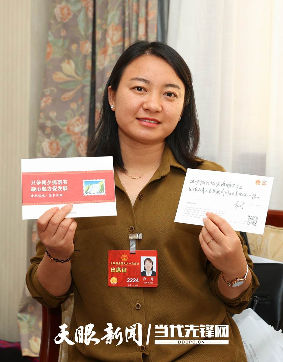 全国人大代表卢丹展示“只争朝夕抓落实凝心聚力促发展”明信片
