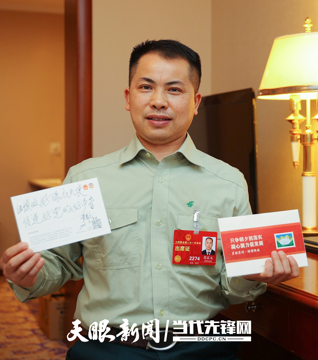 全国人大代表莫富元展示“只争朝夕抓落实凝心聚力促发展”明信片