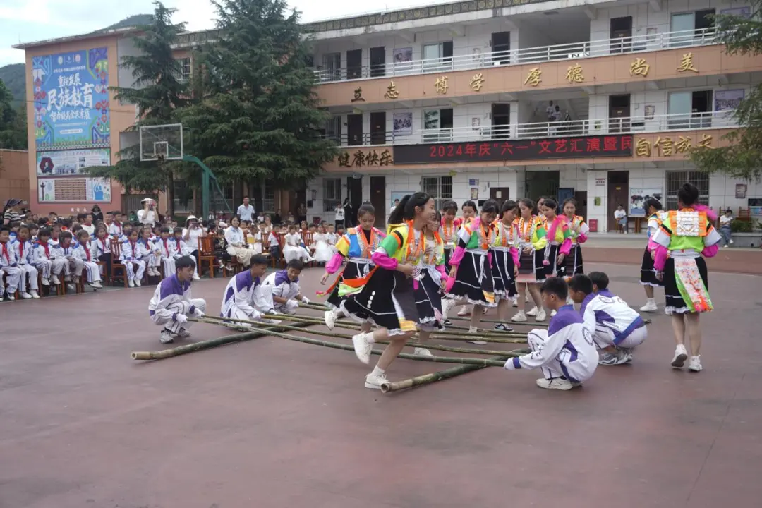 在花溪民族中学,文艺汇演暨民族文化进校园项目成果展演活动正在进行。来自全校九个年级27个班的同学大展身手,带来了三十余个精彩节目。其中,极富民族特色的竹竿舞、踩高跷等节目十分吸引眼球。同学们通过参加展演,留下专属童年的美好回忆。