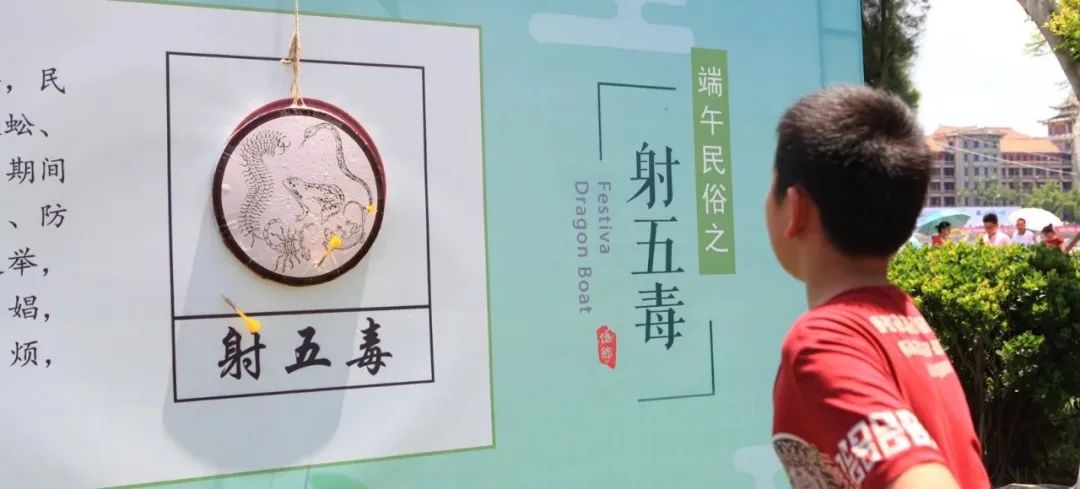 端午传统民俗趣味游戏自然也少不了。射五毒将蝎子、蛇、蜈蚣、蟾蜍、壁虎五种毒虫的画像挂在墙上,用飞镖射之,射中即获胜。这个游戏看似简单,但想要射中可不容易噢~
