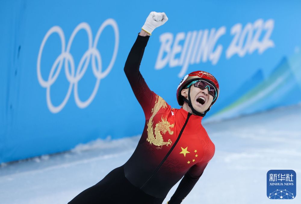 在北京首都体育馆,中国队选手武大靖在北京2022年冬奥会短道速滑项目混合团体接力决赛后庆祝夺冠(2022年2月5日摄)。新华社记者 杨磊 摄