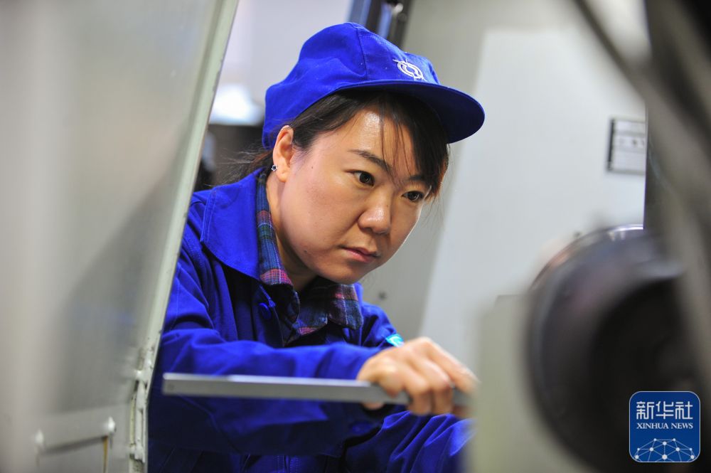 在中国兵器内蒙古第一机械集团有限公司第四分公司,赵晶为数控机床更换精加工所用的刀片(2018年3月5日摄)。新华社记者 彭源 摄