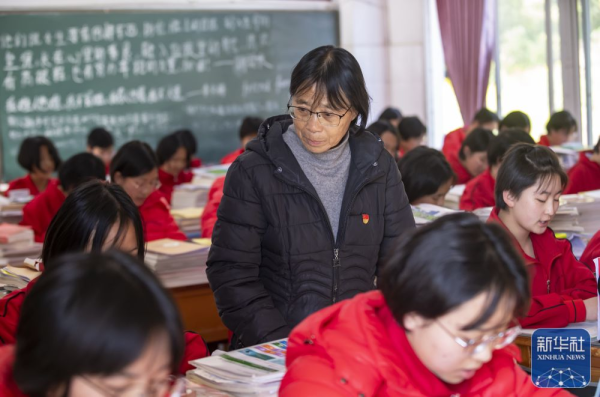 张桂梅(中)在教室里检查学生上课情况(2020年12月1日摄)。新华社记者 陈欣波 摄