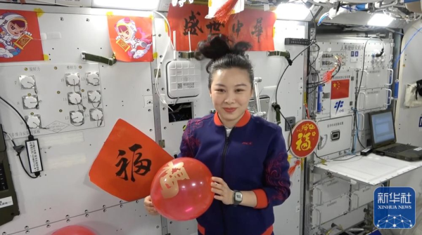 2022年1月31日,农历除夕,神舟十三号航天员王亚平在遥远的太空专门发来视频,向祖国和人民送上祝福(视频截图)。新华社发