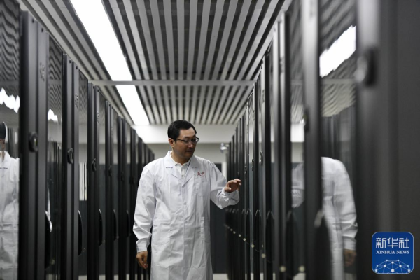 在国家超级计算天津中心“天河一号”机房内,孟祥飞在查看设备运行状态(2021年5月27日摄)。新华社记者 赵子硕 摄