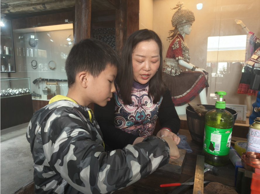 一旁的木案前,10岁的陈品润正反复摩挲银戒表面,进行最后的抛光工序。“纹样是师傅帮我刻的祥云,这是我给妈妈准备的母亲节礼物。”尽管额角沁出汗珠,他的动作却格外轻柔,“虽然制作辛苦,但我想继续学下去,以后要像张老师一样做出更漂亮的银饰。”