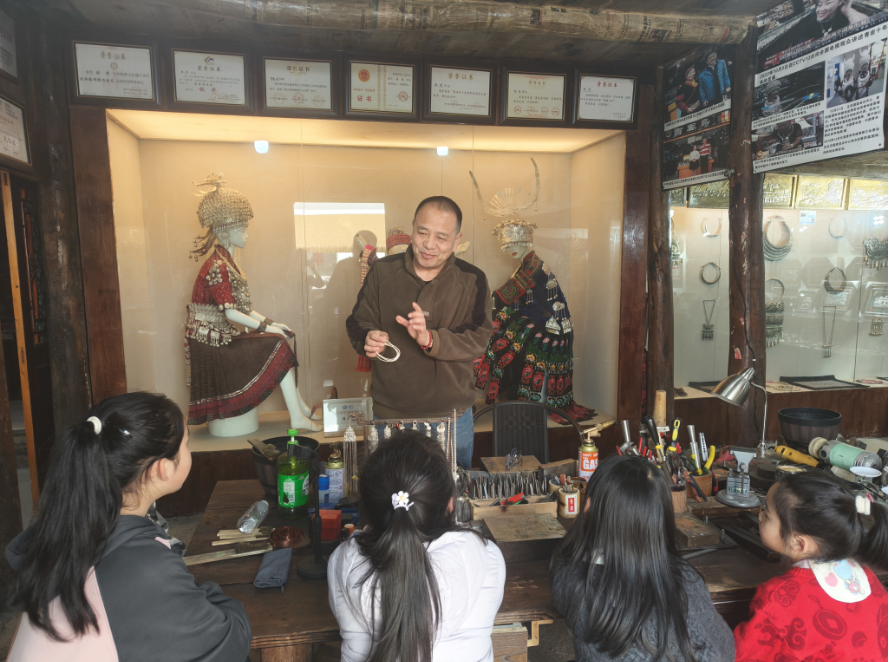 “叮叮当当、叮叮当当……”春日晴好,贵阳市花溪区青岩镇龙井村的千年槐树旁,银器敲打声与布依山歌交织成韵。