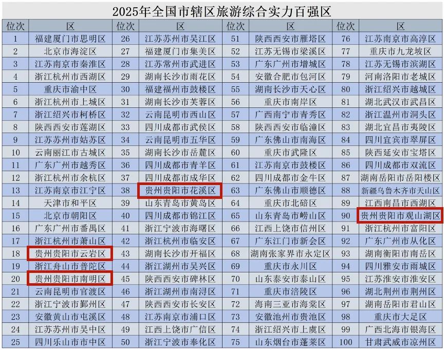 5月11日,以“打造文旅新品牌 满足消费新需要”为主题的2025世界品牌莫干山大会·文旅系列活动在浙江省湖州市举办。活动期间,《全国市辖区旅游研究报告2025》正式发布,贵阳市云岩区、南明区、花溪区、观山湖区入选2025年全国市辖区旅游综合实力百强区。
