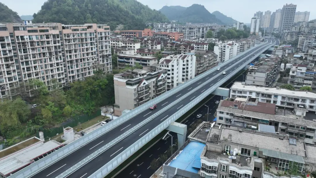 据了解,清溪路-花冠路节点大桥位于花溪中心城区,大桥起于杨柳巷口,向南延伸至兰馨桂馥花园东门,大桥采用钢箱梁高架桥,跨越地铁学士路口站及花冠路、香椿路口、红阳厂大门,改造道路全长1016m,其中高架桥长580m,采用10跨连续钢箱梁结构,桥梁最高处距离地面8.1m,桥面宽度17.5m。该节点改造通过工程治理的方式将有效解决长久以来路口的拥堵现状,车辆区间通过时间由平均10分钟以上缩减至3分钟以内,通行效率将提升70%以上。