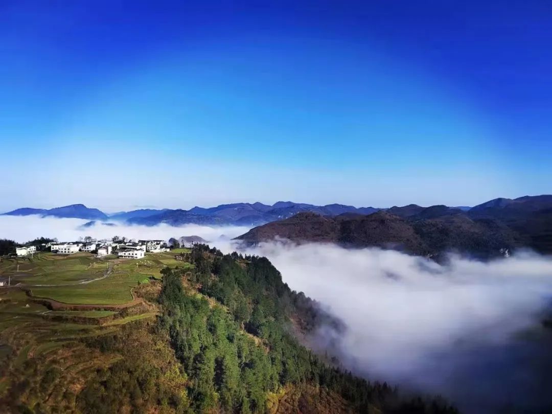 于云海遇见层层梯田,远观青山秀美绵延横亘,俯瞰雨后初霁晴空万里。青瓦白墙、青绿山野,人间烟火气,缱绻入心间。