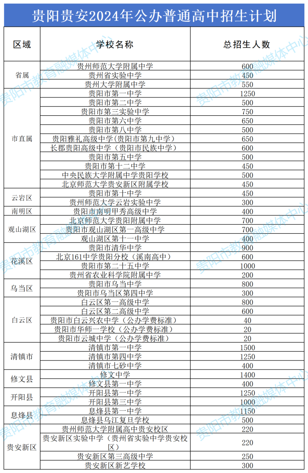 5月31日,贵阳市教育局公布了2024年普通高中招生计划及配额生分配办法。