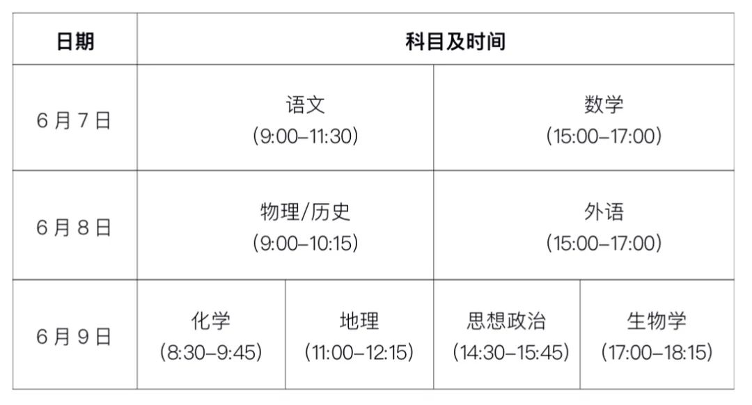 语文科目考试时长为150分钟,数学、外语(含听力)科目考试时长为120分钟,物理、历史、思想政治、地理、化学、生物学科目考试时长均为75分钟。