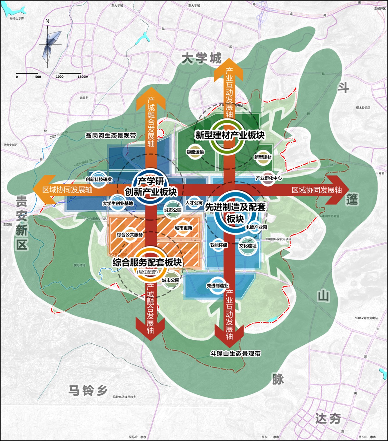 “四片”:根据用地主导功能划分为四大功能片区,分别为综合服务配套板块、先进制造及配套板块、新型建材产业板块、产学研创新产业板块。