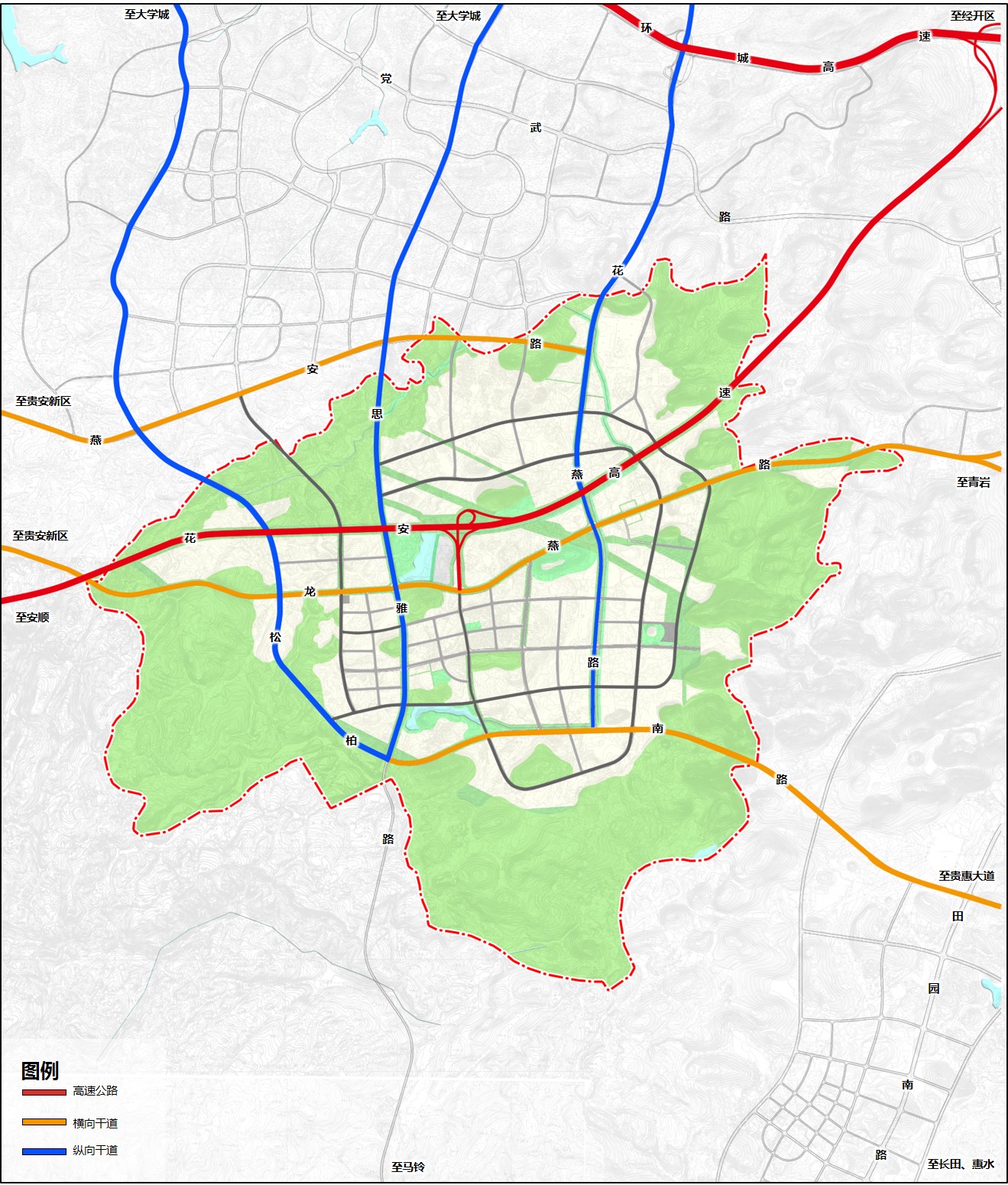 花燕路:道路规划红线宽度40米,双向六车道,道路红线外两侧设15米宽绿带,总控制宽度70米。