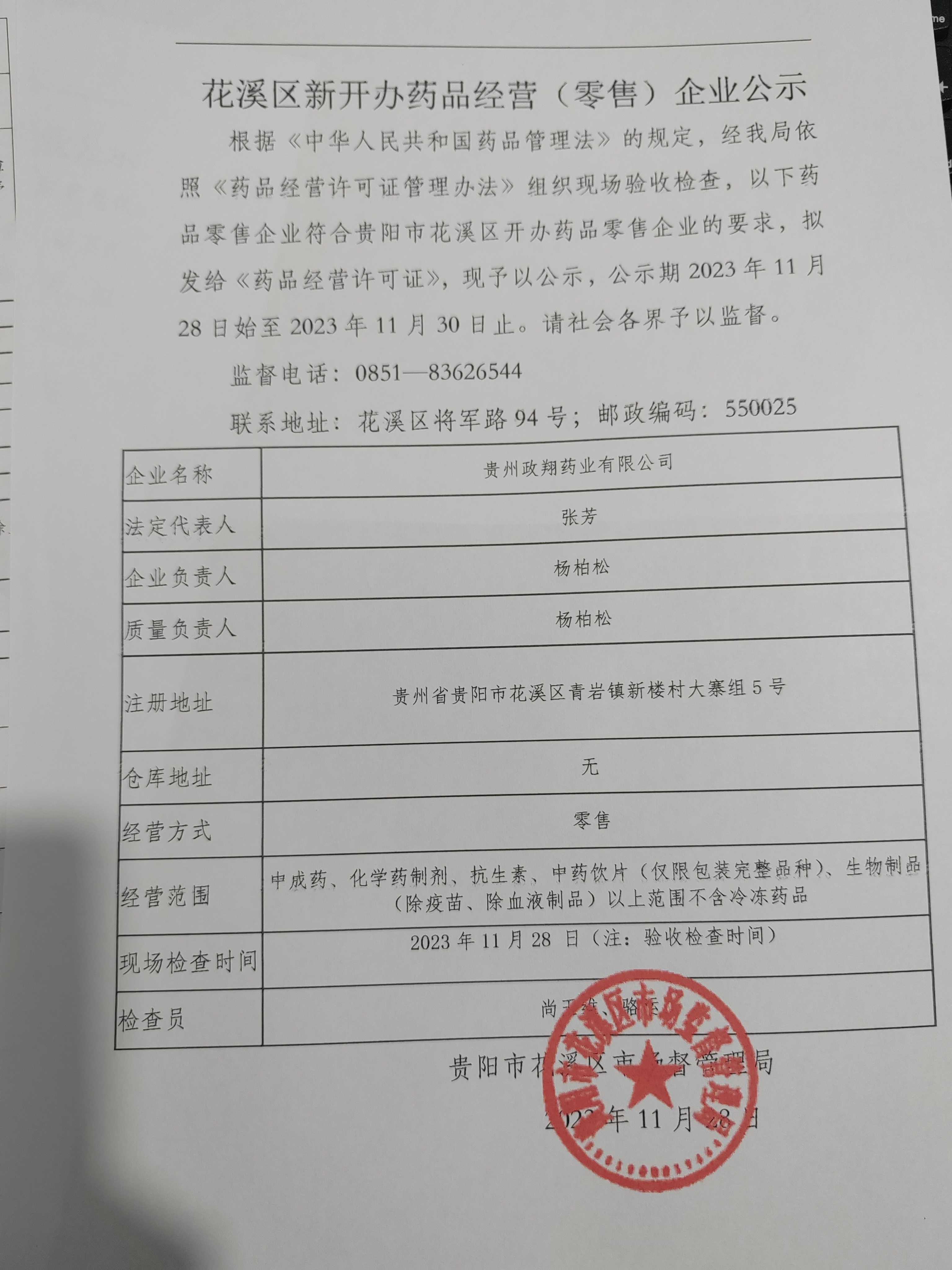 花溪区新开办药品经营(零售)企业公示-贵州政翔药业有限公司