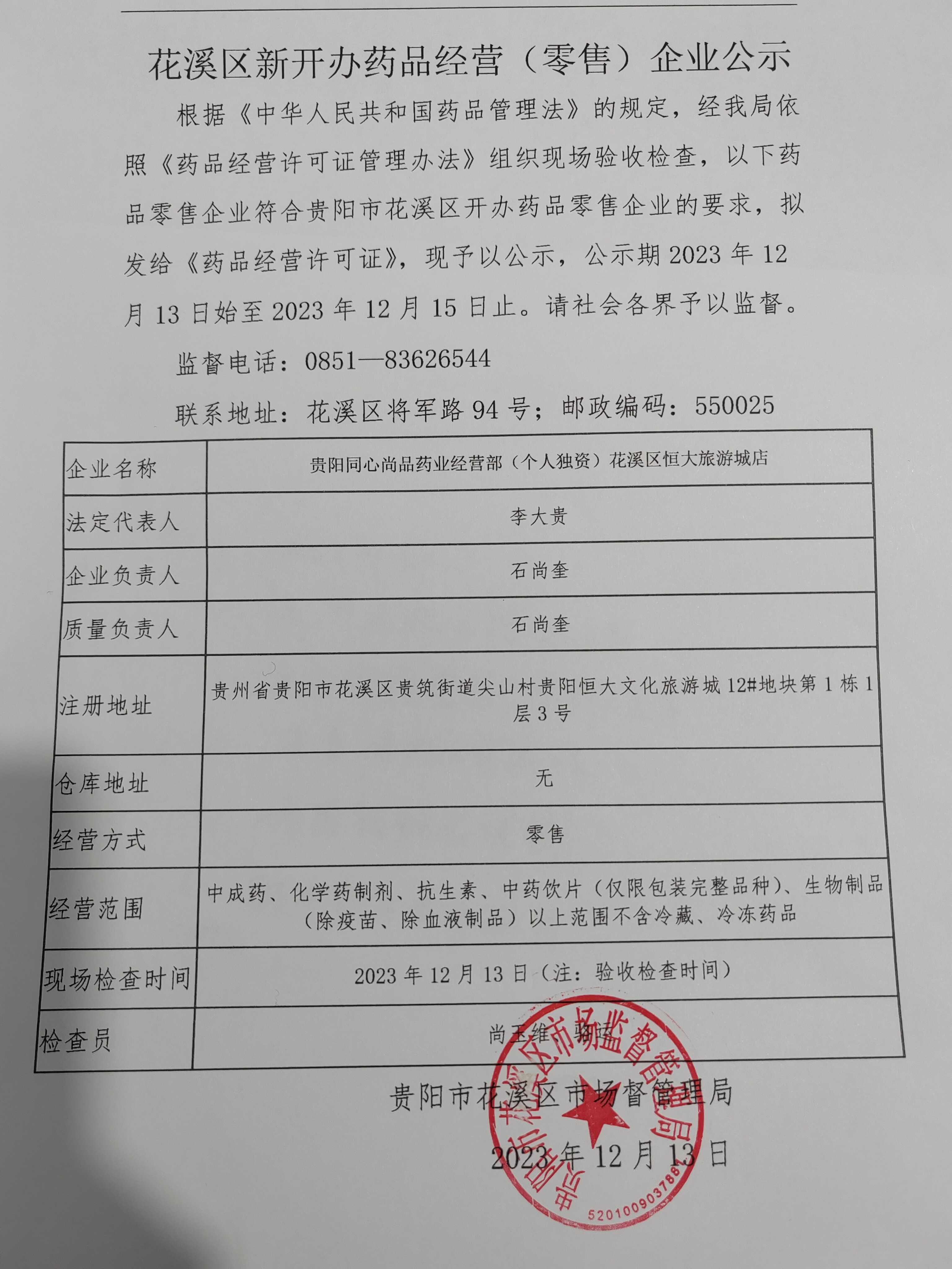 花溪区新开办药品经营(零售)企业公示——贵阳同心尚品药业经营部(个人独资)花溪区恒大旅游城店