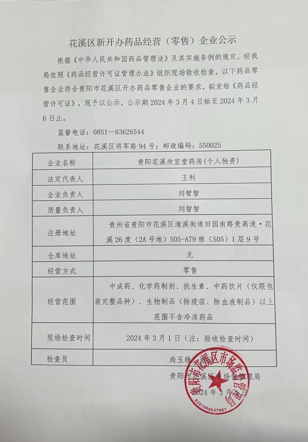 花溪区新开办药品经营(零售)企业公示 ——贵阳花溪欣宜堂药房(个人独资)