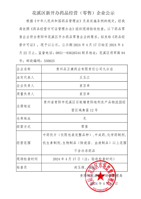 花溪区新开办药品经营(零售)企业公示——贵州品正康药业有限责任公司九分店