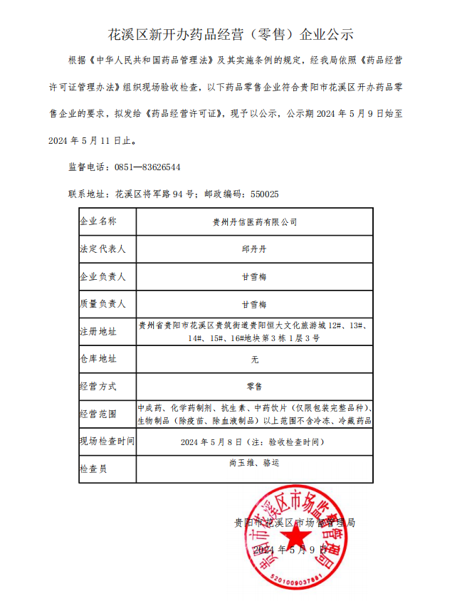 花溪区新开办药品经营(零售)企业公示——贵州丹信医药有限公司