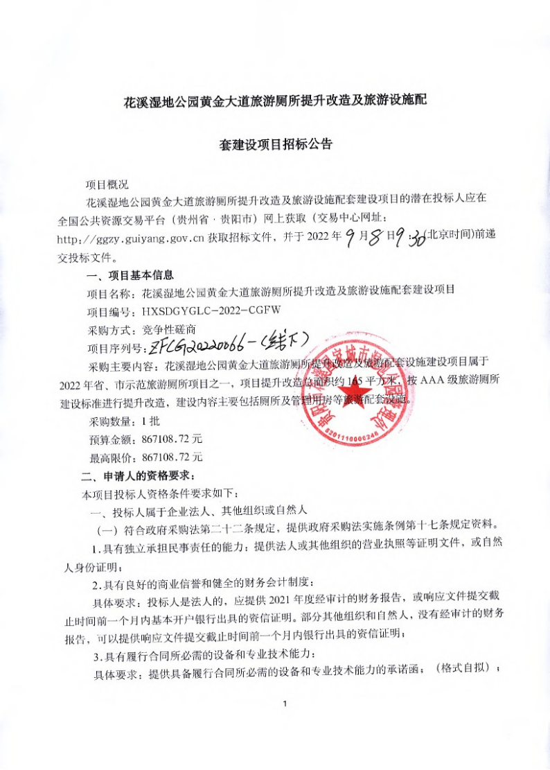 花溪湿地公园黄金大道旅游厕所提升改造及旅游设施配套建设项目招标公告