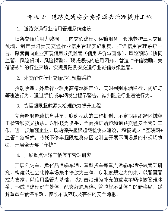 一是法规规章、标准规范持续修订。多部门齐抓共管,制定《贵阳市道路交通安全条例》、《贵阳市校车安全管理实施办法(暂行)》、《贵阳市道路交通安全与管理设施设置导则》、《贵阳市网络预约出租汽车经营服务管理暂行办法》等,能够指导相关部门及行业有效开展工作。