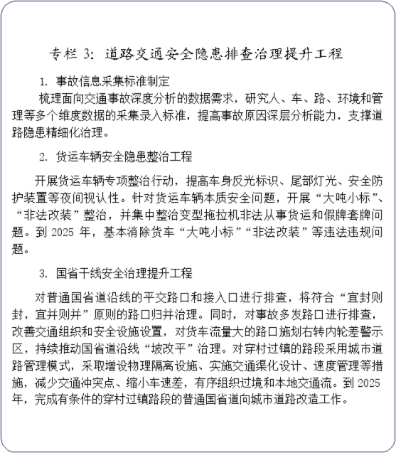 道路安全基础设施有待完善。一是规划设计层面对交通安全的考虑相对不足,部分线路的设计受地形约束,运用平纵面的线形指标标准较低,道路交通安全设施“三同步”落实不到位,对驾驶员的容错不足;二是部分国省道存在道路安全设施不健全,“穿村过镇”路段城镇化改造滞后;三是农村公路交通安全设施缺失较多,隐患治理资金难落实、缺口较大;四是城市非机动车道网络建设滞后,与日益增长的出行需求不匹配;五是城市核心区立体过街无障碍率偏低,外围部分干道缺少人行过街通道。