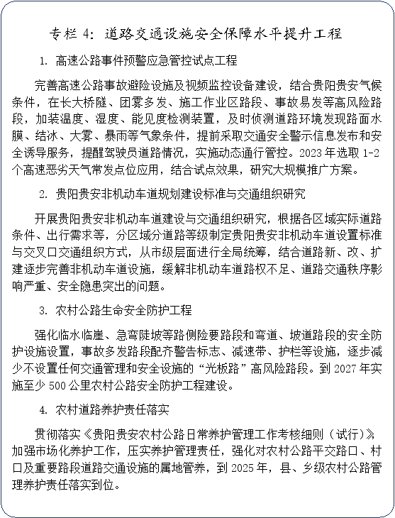 加快贵阳贵安各等级公路新、改扩建,提升高等级公路占比。结合贵阳贵安山多雨日多的自然条件,根据项目实际情况积极将地方公路建设标准技术运用到初步设计、施工图设计中,充分考虑和预见各种道路使用者失误的可能和其他极端情况,提早实施干预措施,提高容错率。强化国省道路侧险要路段、急弯陡坡、临水临崖等重要路段路侧护栏标准化设置。加强路侧护栏巡检,及时进行设施维护和更换。优先推动设计时速快、交通流量大、易发生正面碰撞事故路段中央隔离设施建设,规范设置中央隔离开口位置、大小、数量。加强城镇化、穿村过镇路段交通安全管理,按照城市道路标准配置交通标志、信号灯、机非隔离、路灯等设施;加强路段速度管理,完善限速标志和强制减速设施,减少速度差。排查治理公路平交路口和沿线开口安全隐患,规范安全设施和安全视距。持续开展交通流量较大、事故多发的穿村过镇路段综合治理,提升交叉口渠化设计标准。