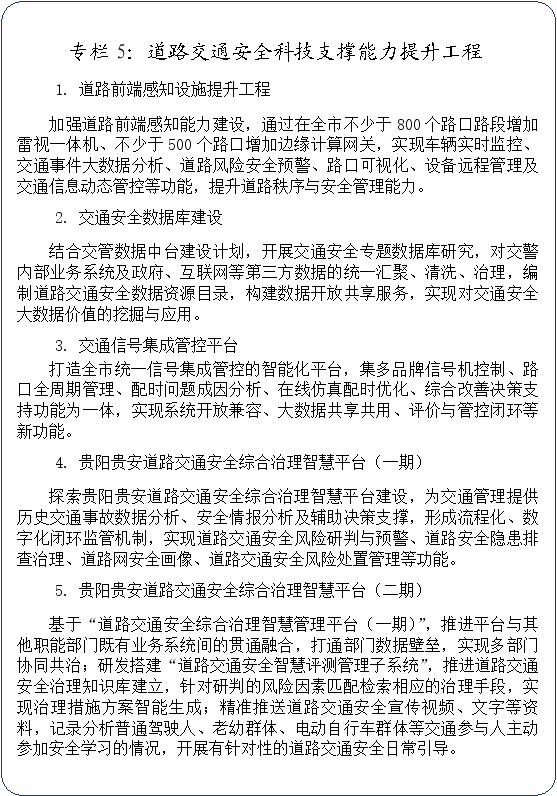 加强道路交通安全智慧管控顶层设计,靶向风险问题,依托云端、边缘算法、算力和前端感知、管控设施,完善智慧交通风险管控策略、模型和应急预案。健全道路前端感知设施标准体系,鼓励在道路新基建和改造提升项目中,增加道路前端感知设施建设,借助新一代通信与数据处理技术,加强道路交通基础数据采集,提高道路异常事件检测能力。推进全市智慧信号灯增加、扩容、联通,升级智能交通管控平台,构建全市智能灯控“一张网”,实现感知、认知、诊断、优化、评价闭环管理。根据《贵阳贵安智慧道路建设技术导则》,推进智慧示范道路与车路协同示范区建设。探索道路设施规、建、管、养全生命周期管理,打造面向道路、桥梁、边坡、隧道等道路安全风险源的智慧监测管理平台。推动智慧枢纽、公交站台建设,实现客流实时监测与预警、智慧公交候车等功能。加强“一站三场”及违法揽客黑站点、非法营运车辆异常聚集区域的视频监控力度。