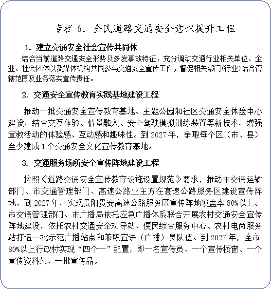 建设一批集成新型科学技术的交通安全宣传教育实践基地,利用安全驾驶模拟训练装置、交通事故案例立体警示教育系统、醉酒状态体验装置等系列新设备,增强宣教活动的体验感、互动感和趣味性。同时,依托现有交通服务设施和业务窗口,开展“面对面、一对一”的交通安全知识普及,提升线下宣传场所的覆盖面。打造贵阳贵安交通安全宣传门户网站及移动学习应用平台,设置面向不同受教群体的交通安全学习专栏,提供系统性、针对性的交通安全宣传教育资源。融合传统媒体与新媒体优势,丰富宣传渠道,以逐步扩大核心受众群并提升受众粘性为目标,构建交通安全话题“朋友圈”。针对在校学生、老年人、职业驾驶人、企事业单位员工等不同群体,通过大数据分析与实地调研,综合研判各年龄段、各行业群体的认知习惯、出行特征、时空特征等因素,编制系列交通安全宣传图册,开展交通安全法律、法规学习等交通安全实践活动,做到不同年龄段、不同行业群体、不同交通行为“全覆盖”,提升交通安全宣传的精准度与实效性,并将道路交通安全宣传纳入学校教学、企事业单位的安全生产培训体系,保证教学内容的连贯性。