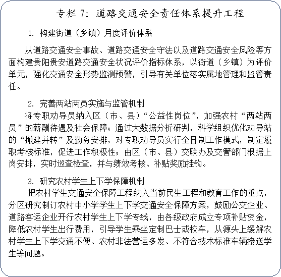 按照“党政同责、一岗双责、齐抓共管、失职追责”要求,坚决落实《地方党政领导干部安全生产责任制规定》、《贵阳市党政领导干部安全生产责任制实施办法》,进一步加强各级党委、政府对道路交通安全工作的领导,推动道路交通安全与社会经济协调发展。充分发挥各级道路交联办统筹组织、指导协调、督查考核职能作用,严格落实联络协商、工作会议、联合执法、分析通报、调研指导、警示约谈、督查考评等工作制度。各级政府与有关部门按照“管行业必须管安全、管业务必须管安全、管生产经营必须管安全”和“谁主管谁负责”“谁审批谁监管”的原则,严格落实安全管理职责规定。机构编制部门要明确各有关部门交通安全工作职责并纳入部门“三定”方案,进一步厘清综合监管、行业监管和属地监管的关系,形成监管边界清晰、分工明确的责任体系和监管合力。负有交通安全监管职责部门应按照职责分工,依法履行监管职责,从行业规划、产业政策、法规标准、行政许可等方面加强交通安全和职业健康日常管理。要进一步落实农村道路交通安全责任制,完善“两站两员一长”的管理办法,细化政府部门、综治部门、村居两委责任,研究农村道路交通安全专项资金长效机制并把农村学生上下学交通安全保障工程纳入当前民生工程和教育工作的重点。