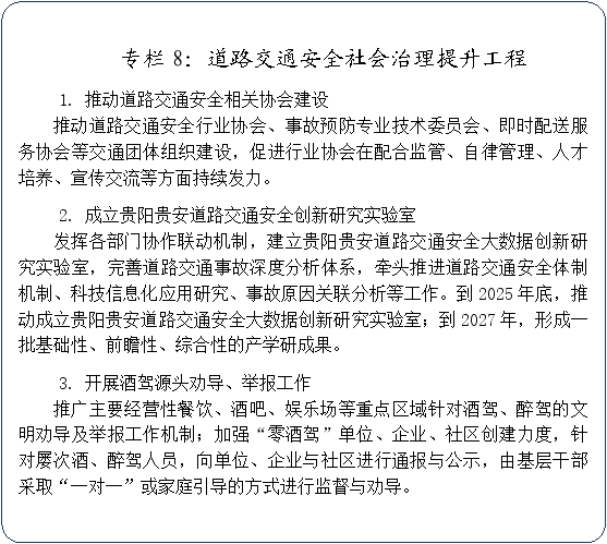 总体目标:到2027年,贵阳贵安道路交通安全形势显著改善。基本形成“体制机制引领、部门协同共治、基础设施完善、主体责任压实、科技应用支撑、本质安全改善、安全知识普及、社会共同参与、应急救援高效”的现代化道路交通安全体系,推动交通安全治理模式由“事后治理”向“事前预防”转型。促进道路交通向高质量发展,使人民出行安全感明显提高,道路交通安全治理能力在西南区域达到领先水平,为“强省会”行动提供有力支撑,以实际行动擦亮多彩贵州、爽爽贵阳名片。