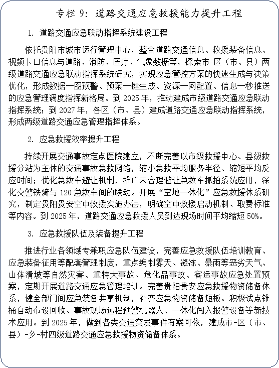 依托贵阳市城市运行管理中心,研究市-区(市、县)两级道路交通应急联动指挥系统建设,打通警医信息系统壁垒,完善信息共享机制,实现应急管控方案的快速生成与决策优化,形成数据一图预警、预案一键生成、资源一网配置、信息一秒推送的应急管理调度指挥新格局。推进道路交通事故应急救援物资储备库,健全部门间应急装备共享机制,补齐应急物资储备短板,积极试点锥桶自动布设回收、事故现场远程预警机器人、一体化闯入报警设备等新技术应用。完善气象灾害、地质灾害、事故灾害、重大公共卫生事件和突发安全事件等交通应急预案体系,模拟不同场景可能的突发情况,加强针对性应急处置演练,制定便于操作执行的处置流程,定期组织开展联合演练和考评。加强涉危险化学品运输企业应急能力建设,提升初期事故应急处置能力。培育市场化、专业化应急救援组织,鼓励公益组织、保险行业等力量参与道路交通应急处置与救援。加强对急救一线医护人员人身安全的保护,完善安全知识培训和反光锥、反光背心等安全防护设施配备,避免二次事故风险。